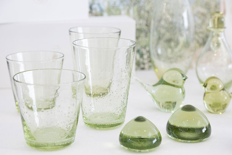 杉山さん Aji Glassは庵治石を使って青色を出していますが、Olive Glassはオリーブ枝葉と実を使って、この緑色を表現しています。ただ、この色合いを出すのがとても難しくて。配合する枝葉の比率や火加減によって、とても濃い抹茶色になってしまうこともあれば、灰色になってしまったり、かえってまったく色が出ず透明になってしまったりするときもあります。非常に不安定なのです。そのため、現在は完全受注生産にさせてもらっています。香川県はオリーブの名産地でもあります。やはり、このOlive Glassを通して香川県を想ってもらえたらいいなと願っています。