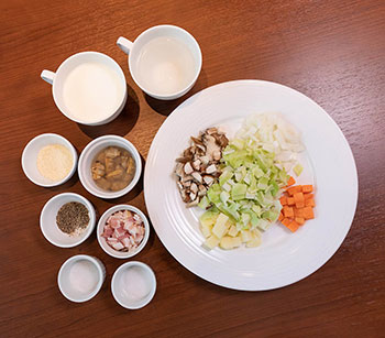 - 野菜ときのこ、ベーコンはすべて 5mm~1cm ほどの角切りにする。