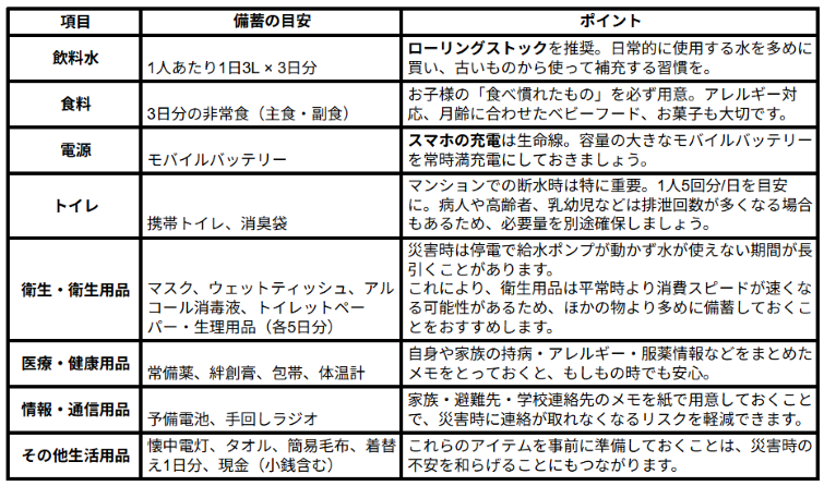 マンションの構造や共用部の備え(非常用電源、防災倉庫など)を最大限に活用しつつ、ご自宅で3日間を安全に過ごすための「初期備蓄」を完璧にすることが、新生活を安心して送るための土台となります。
