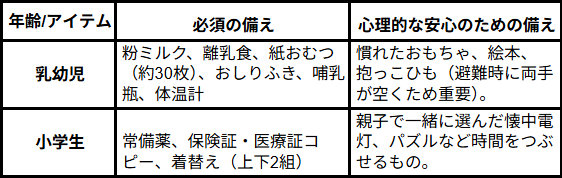 (1)子供の年齢別「安心備蓄」リスト