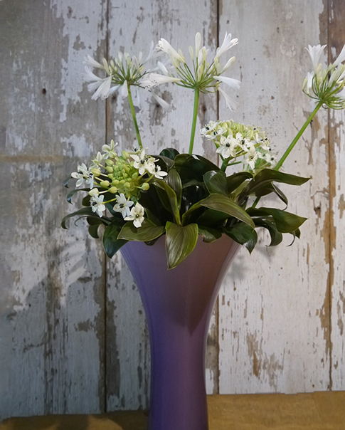 上部:存在感のある華やかな印象のアガパンサス。青いガラスの花瓶が、白とグリーンの組み合わせをさらに引き立たせます。花瓶の組み合わせで、さまざまなイメージが楽しめます。