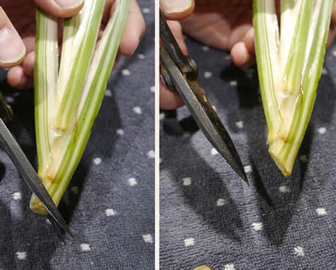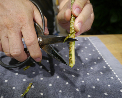 花屋さんの店頭に並んでいるお花は、仕入れ後、「水上げ」を行ないます。切り口を斜めにカットしたり折ったり、割ったり、あるいは「湯上げ(熱湯に切り口を数秒間浸けるやり方)」などの「水上げ」を施します。