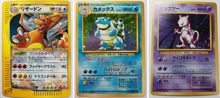 現在、高値で取り引きされているポケモンカードの例。(左)人気のリザードン・クリスタルタイプ(2002年発売)。(中央)カメックス(1996年発売の初版)。(右)ミュウツー(1996年発売の初版)。