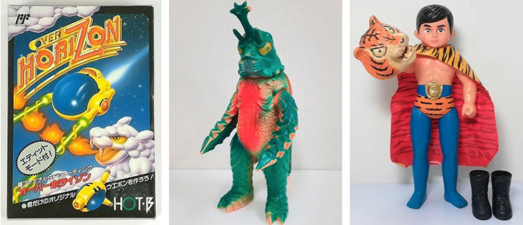 (左)『オーバーホライゾン』のパッケージ(1991年発売)。(中央)1970年代製造、ゴジラシリーズ登場の怪獣メガロのソフビ人形。数十万円の見積り。(右)1970年代製造、タイガーマスク・ジャイアントソフビ人形。 9万2,600円の値が付いた。
