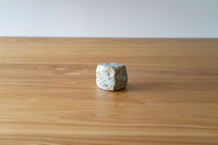 - それぞれを袋から取り出し、手で軽く棒状にする。その後くっつけて1つにし、真ん中あたりで半分に折る。再度棒状にする作業を繰り返し、最後に形を整える。色の異なる2種類を合わせることで、きれいなマーブル模様の石けんになる。