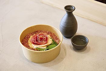 併設バーでは、“映え”よりもお酒との相性で選んだフードも用意している。ピンクペッパーを振りかけた「北海道産 炙り燻製ほっけ」や「本日のチーズ」などのつまみをはじめ、食べ応えのある「まぐろとサーモンの二色丼」といった丼も用意。