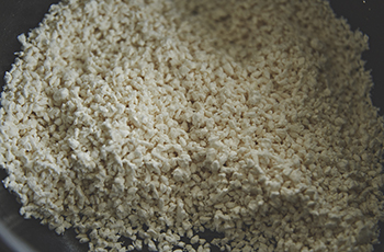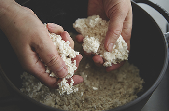 ① 乾燥麹を手のひらで揉み合わせたりしながらよくほぐす。