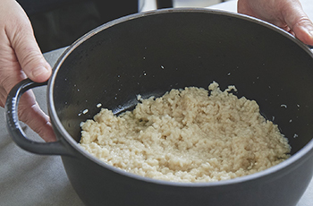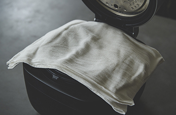 ⑤ 60℃で保温しながら、ひと晩(6~8時間)温める。途中で軽く混ぜよう。温度が低いと発酵が進まず、熱すぎると麹菌が死滅してしまうので、温度管理が一番のポイント。真藤さんは鋳鍋で作っているが、写真のように、④を炊飯器に入れて〈保温〉スイッチを押し、上に畳んだ布巾をかけて蓋を開けておくと、だいたい60℃がキープされる。蓋を閉めると60℃以上になってしまうので注意。ヨーグルトメーカーがあれば、温度管理がより簡単だ。