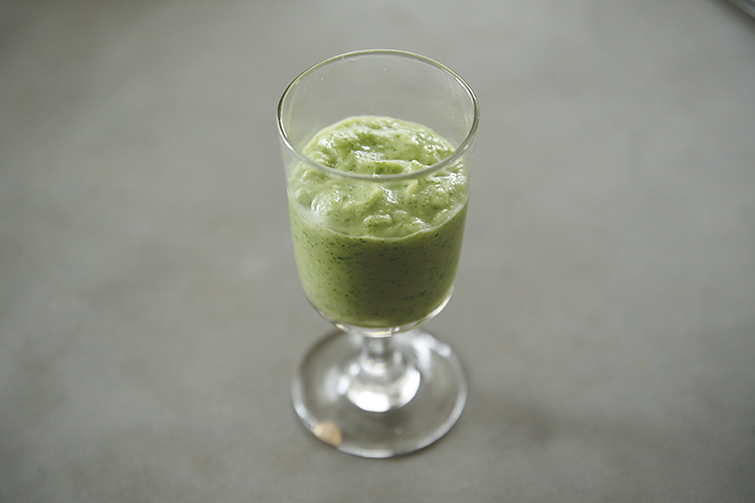 小松菜とバナナはざく切りにし、甘麹、水と合わせて、ミキサーやブレンダーで滑らかになるまで攪拌する。