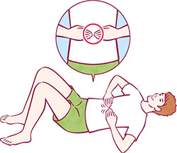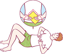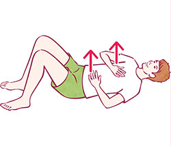 おへそを凹ませることで息を吐こうとする人がいますが、これでは息は吐き切れません。胸が動かないので肺から空気が出ず、肋骨の間にある筋肉が収縮した状態が続いて固まりがちです。そんなときはみぞおちに両手の人差し指や中指をあて、肋骨をぐっと押し上げるようにぐりぐりとマッサージしてください。腹直筋が弛緩しやすくなって楽に息が吐きだせるようになります。