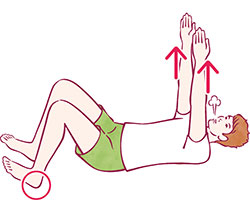 背中はつけたまま踵をぐっと下に引き込むよう力を入れます。両手を真上に伸ばしながら息を吐き切ります。踵は引き込んだまま鼻から息を吸って両手をさらに天井の方に伸ばしていきます。こうすると肋骨を下げながら息を吐きやすく、吸うときも下がったまま吸えるので、本来の呼吸で活用すべき筋肉がうまく使えるようになります。