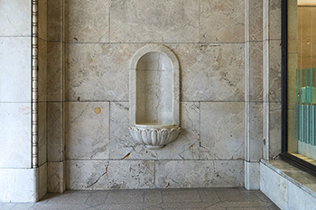 「そういえば、正面口入口脇にイタリア産石灰石で作られた水飲み場跡があるのですが、お気づきになりましたか」と改めて案内されて表に出た。