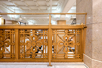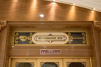 当時最先端だったエレベーターや、贅の限りを尽くした意匠で知られる高橋貞太郎のデザイン。だが、2階バルコニーのきらびやかな金色の手摺子は、実は木製である。もちろん、創建当時は金属製だった。戦時中の金属類回収令により、この手摺子やシャンデリア、エスカレーター、エレベーターの一部などが供出されたのだという。