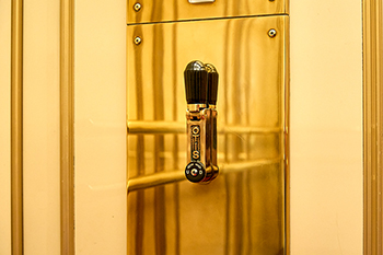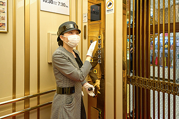 レトロで美しい蛇腹式の扉の開閉は、創建当時から変わらず今も手動だ。各階に到着すると、案内係が優雅な動作で利用客の出入りを促し、安全を確かめて、レバーを操作しカゴを昇降させる。その姿を見るだけでも気分が高揚する。
