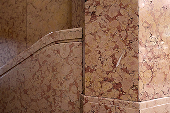 正面エレベーターの壁はこのほか、3階以上は黄色みを帯びた国産の「黄更紗」、屋上はトレビの泉にも見られる白亜のイタリア産「トラベルチーノロマーノ」と、大理石が使い分けられている。高橋貞太郎の真意は分からないが、1、2階同様、石材の特徴を見極めて使い分けたのだろう。