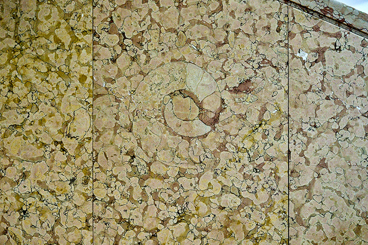 ジュラ紀後期、2億年ほども前の地層から切り出されたネンブロロザートには、アンモナイトやイカの祖先といわれるベレムナイトなどの化石が多く潜んでいるという。
