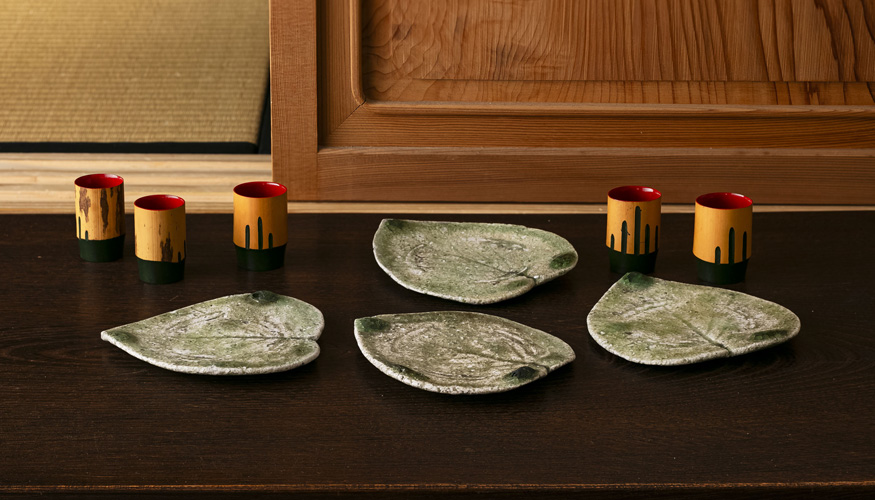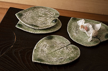 自作の穴窯から生み出される、器面を流れる美しいグリーンは、唯さん独自のものだ。自然の中にそのまま在るかのような佇まいの木ノ葉皿は、テーブルに銘々皿として重ねて置くだけでも人目を引く。