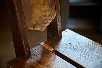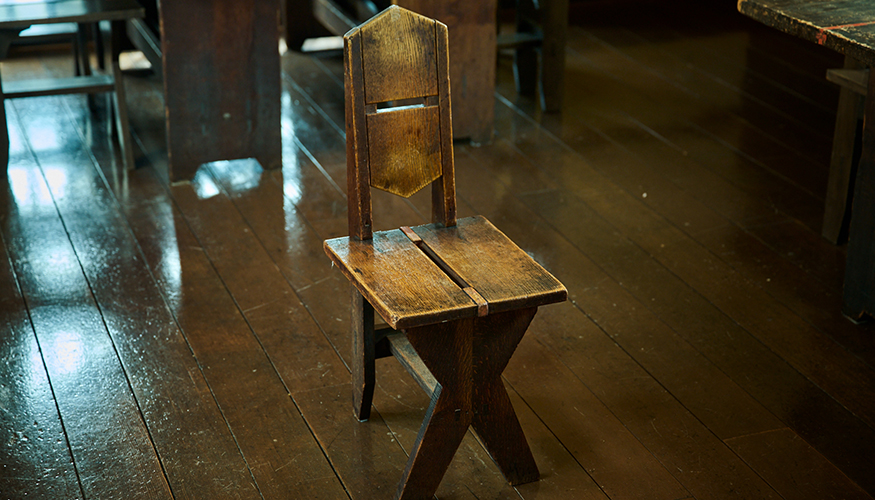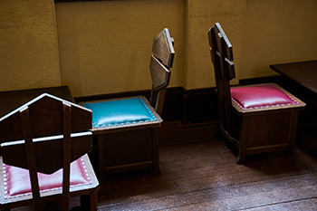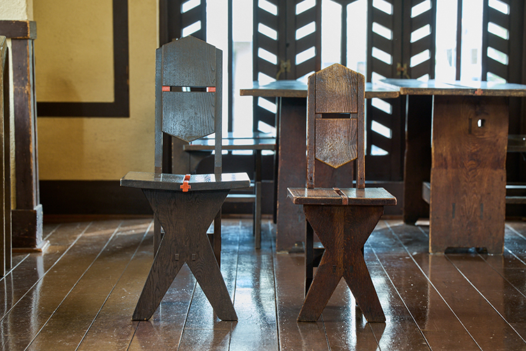 自由学園明日館は、日本で初めて、建築を使いながら保存する「動態保存」が認められた重要文化財である。どの椅子も、“重要文化財の展示品”ではなく、現在も日常的に使われているものばかりだ。