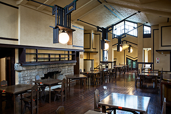 食堂のメインフロアのテーブルは、保存修理工事の際に現代人の体格に合わせて作られたものだ。ここで結婚披露宴などのイベントを開催することを考えると、古い机のままでは支障が出てきたからだという。
