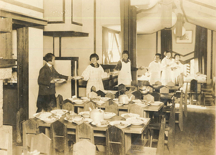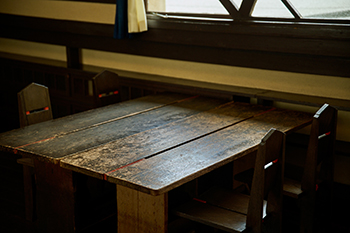一方、増築部分である小食堂で使用されている木製の机は、創立当初から100年以上使われ続けている。日常的に使われているので、たくさんの傷がついているし、女学生が熱い鍋でも置いたのか、丸い跡も残っている。だがそれが、なんともいえず愛おしい。