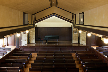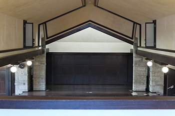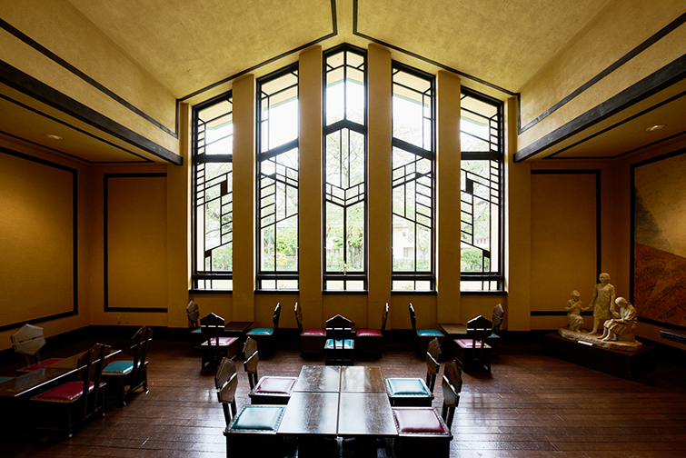 1927(昭和2)年、遠藤新によって最後に手掛けられたのが講堂である。先にフランク・ロイド・ライトと共同で手掛けた中央棟、西教室棟、東教室棟とともに、1997(平成9)年に重要文化財に指定されている。