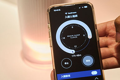 使用するには、専用アプリが必要だ。あらかじめ設定した就寝時刻になると、「BRAIN SLEEP CLOCK」は自動的にキャンドルのように灯る「1/fのゆらぎ」の光を発する。その光は心を穏やかにする効果がある。