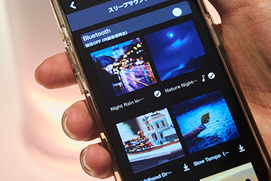 アプリの中にはサウンドライブラリがあり、焚火の音や雨音、波の音といった入眠を促す「1/fのゆらぎ」のヒーリングサウンドが複数採用されている。この中から好みの音を選んで設定しておけばOKだ。