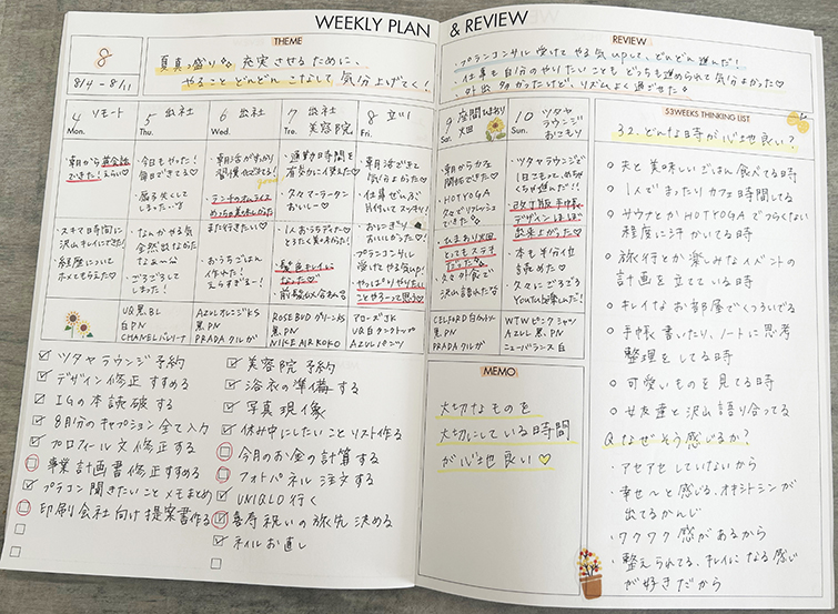 続けていると、手帳を書いている週と書かなかった週では、充実度に差があることを実感できるようになります。メリットがわかれば、自然と続けられるようになるはずです。まずは1カ月、手帳タイムを試してみてください。