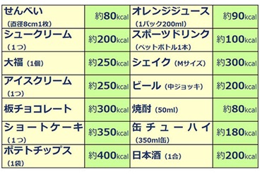 1日3食しっかり食べるだけでも、摂取過剰になる可能性はありますが、何より嗜好品を摂る頻度は、とても増えているのではないでしょうか。表①の嗜好品のエネルギー(kcal)を参照すれば、いかに20kcalを容易に上回るのかがわかります。シュークリーム1つで200kcalはありますから、食べるのと食べないのとでは、カロリーオーバーするかしないか運命の分かれ道といっても過言ではありません。