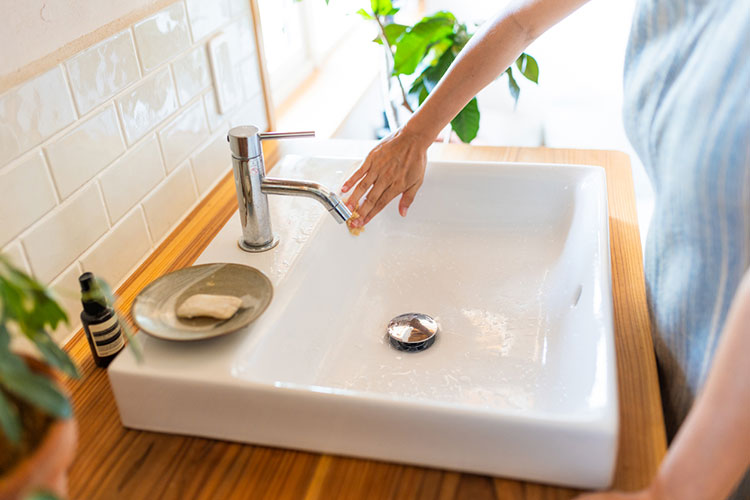家に帰って手を洗う際に、手についた石鹸の泡でそのまま洗面ボウルをなでるだけで清潔を保てる。