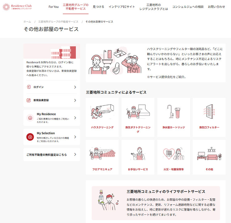 三菱地所コミュニティでは、ハウスクリーニングやフィルター類、浄水器カートリッジなどの消耗品や、設備のメンテナンスに関する必要な情報をご用意しています。「どこに頼んでいいかわからない」というときは、お気軽にお問い合わせください。
