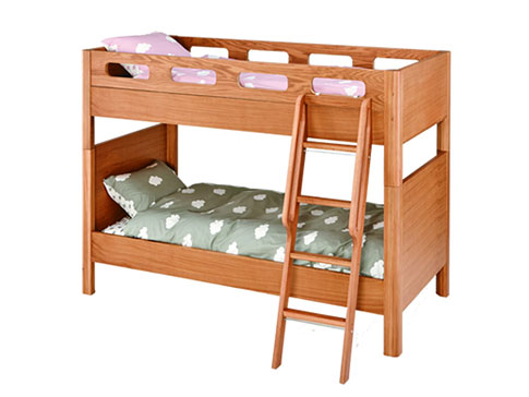 ベッド、デスク、チェスト、シェルフなど、さまざまなパーツを組み合わせて、お子様の人数や成長に合わせて自由に設計できます。あたたかみのある無垢の素材を使ったシンプルなデザインには、木目の美しいオーク材を使用しており、時が経つほどに愛着が増します。