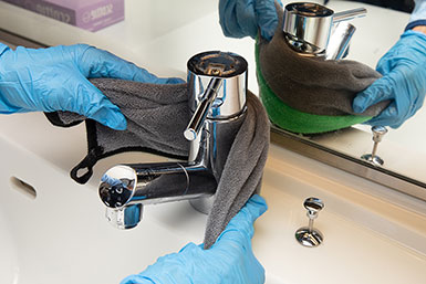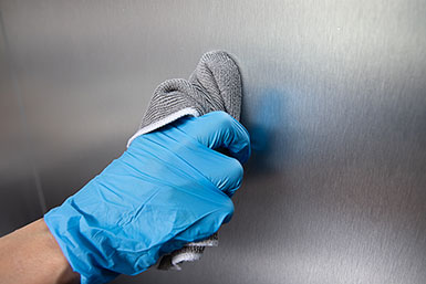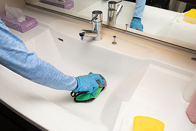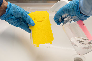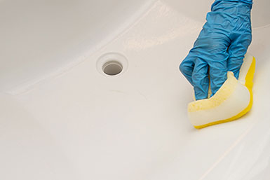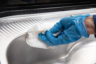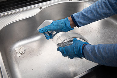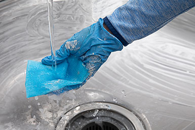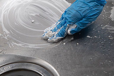 スポンジはクレンザーの研磨効果を弱めてしまうため、シンクはゴム手袋をはめた指で磨くのがおすすめ。指先にひっかかりが感じられなくなれば汚れが取れている証拠です。