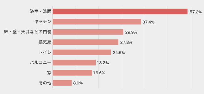 トップは「浴室・洗面」、次いで「キッチン」と、水まわりの設備のお手入れに悩んでいる方が多い結果となりました。カビや水あか、排水溝、におい…など、水まわりは特に気になるポイントが多い箇所かもしれませんね。また、経年劣化が気になる床・壁・天井などの内装、知らず知らずのうちに汚れが付着してお掃除が大変な換気扇など、まめなお手入れが必要なものもランクイン。