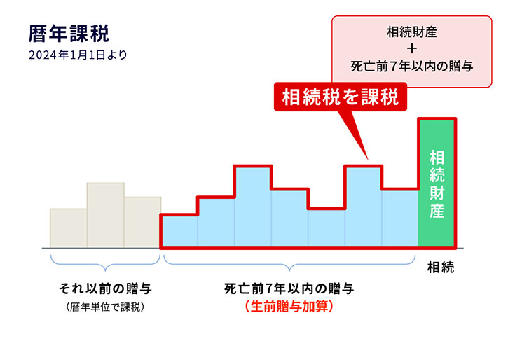 贈与税非課税となった110万円も、相続財産に加算される際には相続税が発生してしまいます。つまり、2024年以降、贈与から7年以内に亡くなった場合は、その贈与分全額に課税されるというわけです。