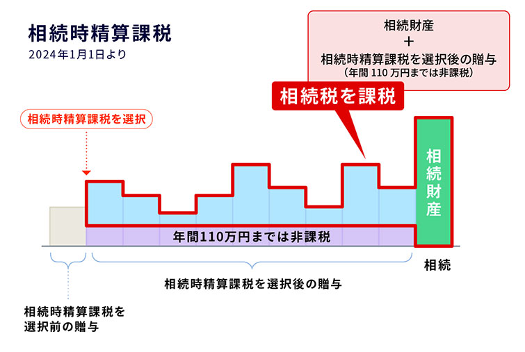 しかし、今回の税制改正により、2024年以降は加算期間が7年になる「暦年課税」よりも、年間110万円が完全非課税となる「相続時精算課税」の方が有利になりやすいといえます。「相続時精算課税」を使うと、亡くなる直前の贈与であっても年間110万円までは非課税になるからです。