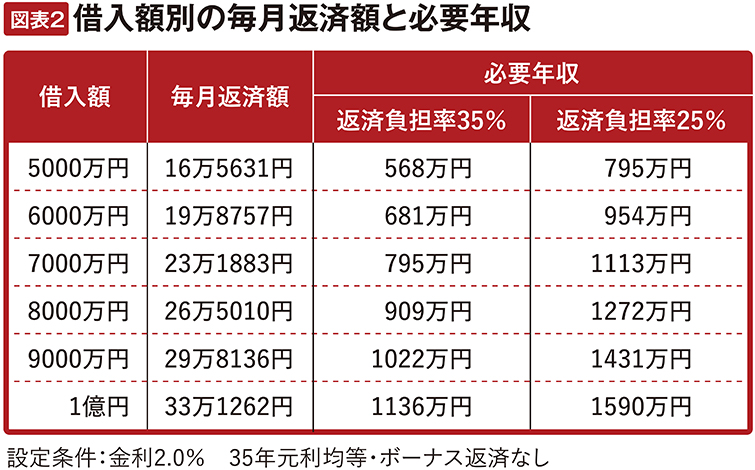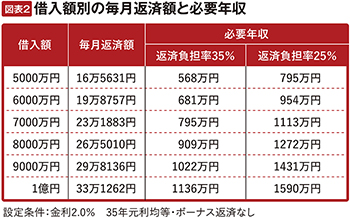 まして1億円の借入額ともなれば、毎月返済額は33万円台で、必要年収は返済負担率35%で1,136万円と1,000万円台となり、返済負担率25%では必要年収は1,590万円に達します。