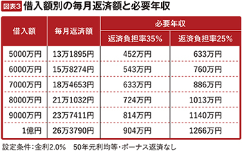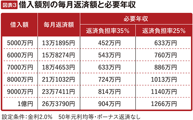 しかし、35年超の返済期間が可能になれば、毎月返済額が減り、必要年収が下がります。図表3は借入額別の毎月返済額と必要年収を、50年返済で試算したものです。