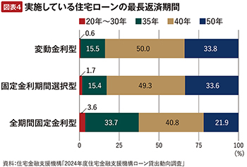 最長35年までの金融機関は変動金利型で16.1%、固定金利期間選択型で17.1%、全期間固定金利型で37.3%で、それ以外は40年、50年返済も可能としています。特に現在の主流となっている変動金利型においては、50.0%は40年返済が可能で、33.8%が50年返済もOKとしているのです。