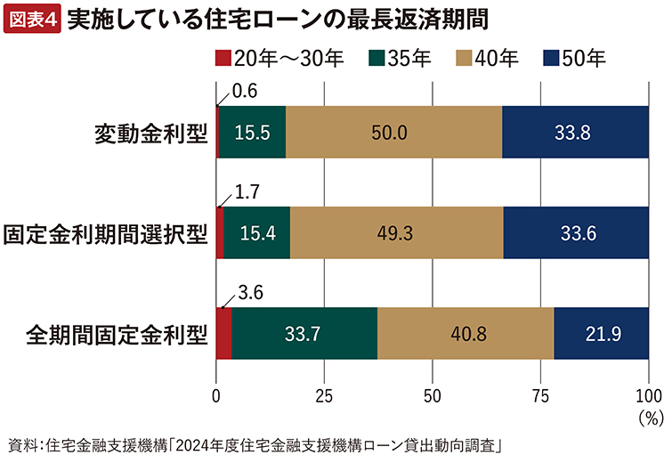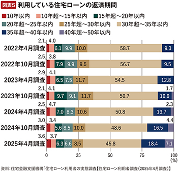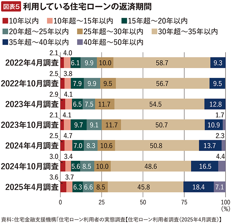 利用者の調査をみても、35年超の返済期間を利用する人が増えています。図表5にあるように、2025年4月の調査では25.5%と、4人に1人が35年超の返済期間を利用しています。
