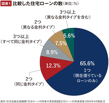 住宅金融支援機構が、住宅ローンを利用してマイホームを取得した人を対象に実施した調査では、図表1にあるように、比較した住宅ローンの数が、「1つ(現在借りているローンのみ)」という人が65.6%に達しています。
