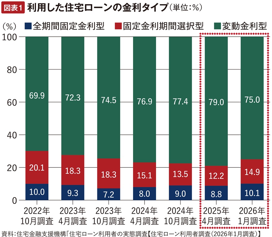 図表1は住宅ローンを借りて住宅を購入した人が、どの金利タイプを利用しているかを示しています。2026年1月の調査によると、金利リスクのある変動金利型の利用者は前回調査の79.0%から75.0%に4.0ポイント減少しており、代わって固定金利型の利用者が増えています。