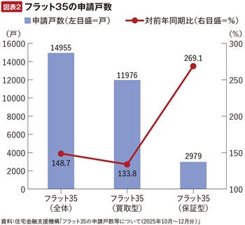 そのフラット35の利用者が急速に増えているのです。図表2にあるように、2025年10月〜12月のフラット35利用のための申請戸数は、前年同期比で148.7%とほぼ1.5倍に増えています。金利上昇傾向に対応して、完済まで金利が変わらない全期間固定金利型のフラット35の安心感が見直されているといっていいでしょう。