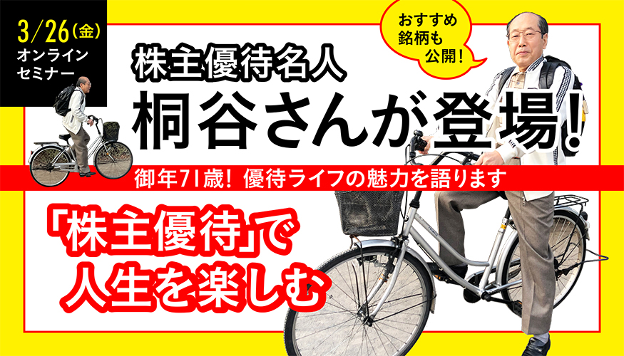 1949年、広島県竹原市生まれ。個人投資家、プロ棋士七段。独学で株を学び、リーマン・ショック以前は時価総額3億円の金融資産を保有していた。現在は株主優待のある銘柄を中心に運用し、現金をほぼ使わない「株主優待ライフ」を満喫している。テレビ、雑誌、講演などで「株主優待」の楽しさを広めている。著書に『桐谷さんの株主優待のススメ 』(祥伝社)などがある。