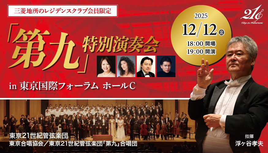 新しい時代の“楽しいオーケストラ”を目指し活動を続ける「東京21世紀管弦楽団」による、三菱地所のレジデンスクラブ会員限定の「第九 特別演奏会」に1,500名様をご招待いたします。