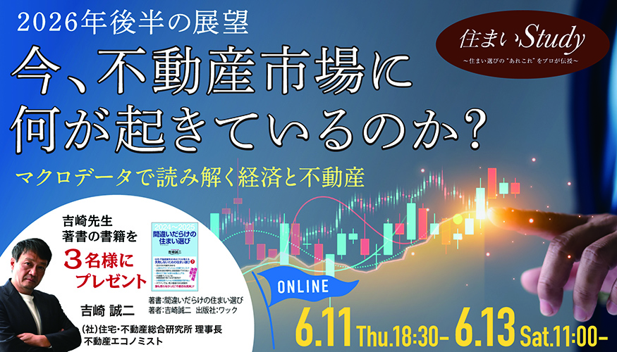 本セミナーでは、専門家が物価・金利・政策動向などのマクロデータをもとに、2026年後半の住宅・不動産市場をわかりやすく解説いたします。マイホームの購入や売却を検討している方はもちろん、今後の不動産動向を知りたい方にもおすすめの内容です。