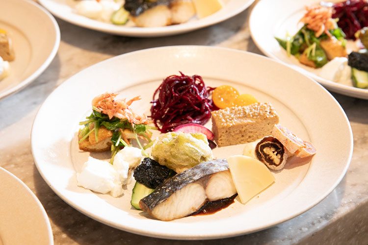 今回のイベントのもうひとつの主役がお料理です。この日、「春と香り」をテーマに用意されたのは、フキノトウとタケノコのフリット、サワラの山椒焼き、旬のサクラエビと三つ葉の和え物など季節を感じられるものばかり。