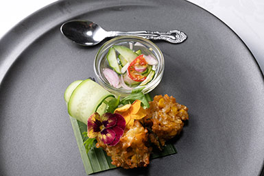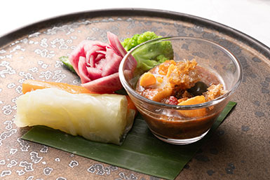 「それが『口中調理』という食べ方です。例えば、前菜の『センワー・クン』という料理があります。これはエビのセビーチェとナマズのほぐし身揚げを野菜に添えた一品ですが、別々に食べるよりも一緒に口に入れることで、エビの爽やかな味わいとサクサクしたナマズフレークが口の中で混ざり合い、料理がより美味しく変化するのです」